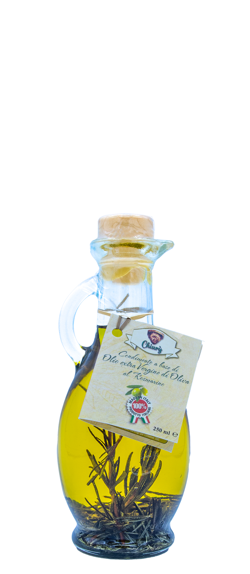 The extra virgin olive oil with rosemary, of an intense yellow color and soft green reflections, is a special combination of extra virgin olive oil (90%) with a natural infusion of rosemary (10%) and a sprig of rosemary.